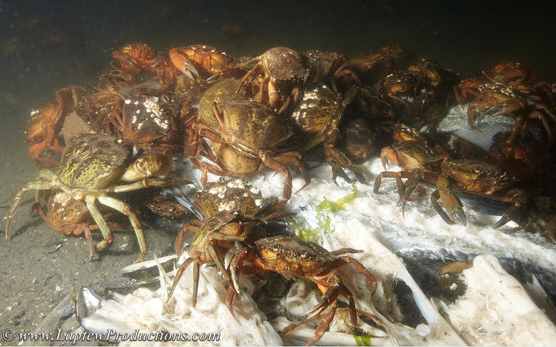 Crabs devouring a striped bass